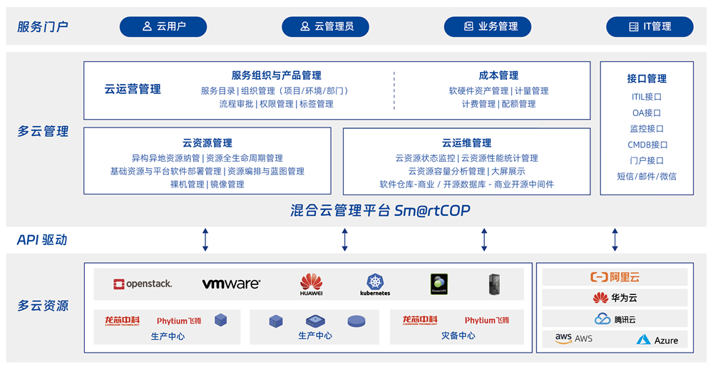 面向各行业用户多云资源管理、、运维及服务提供的综合挑战,,,提供异构异地异芯片多云资源的统一管理、、统一运维、、、、统一监控及统一运营服务,,,简化多云管理复杂度,,,提升用户用云满意度,,,,释放云平台业务价值。。。