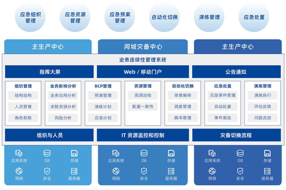 基于业务连续性全生命周期管理的设计理念,,,采用一体化的技术管理平台,,,,将风险分析、、、、业务影响度分析、、预案开发和管理、、、应急演练、、、、应急响应、、、应急恢复等业务连续性相关工作全面覆盖,,,,帮助企业实现数字化的预案建模、、、、资源实例化、、预案演练、、、预案自动化执行、、、审计改进等各环节的闭环管理。。。。
