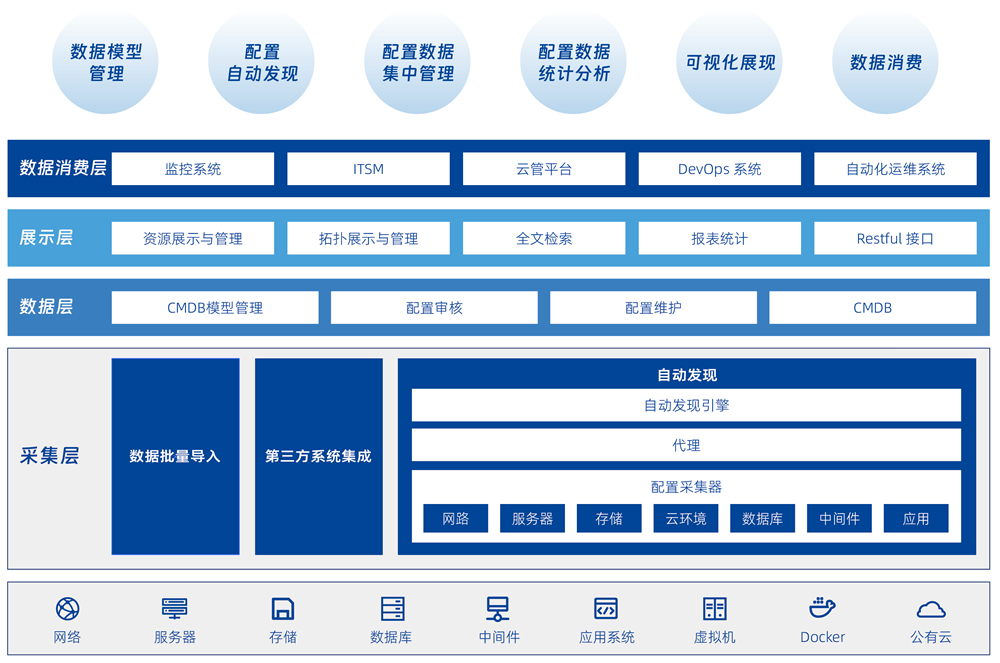 帮助用户建立统一的运维主数据,,通过各种自动化手段实现以应用为核心的全面资源管理以及运维消费场景共享。。。系统具备灵活的 CMDB 分层建模和配置信息维护机制,,可以提供面向业务的 IT 架构画像,,,为各个运维工具提供集中化的资源信息管理和协同,,,,为 IT 运维和 DevOps 体系下的各种运维场景提供数据消费服务。。。