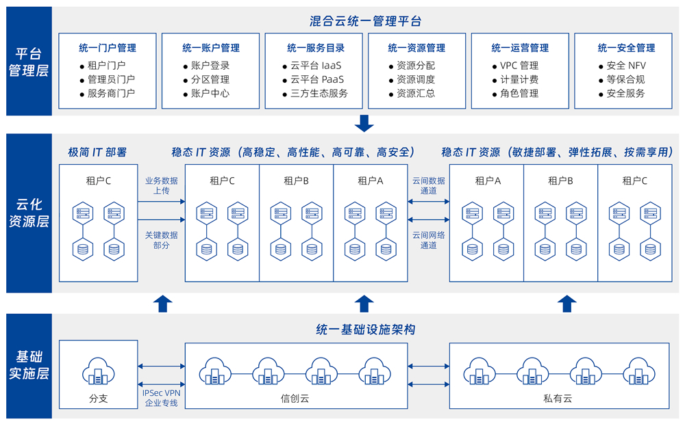 面向已部署多云、、、、信创基础设施的行业用户,,提供自助化、、、、自动化的云服务快速交付服务。。。。管理企业内部多个数据中心的物理、、、虚拟资源,,,以及容器、、私有云、、、、公有云资源,,,并对以上资源进行混合编排,,,提供基础软件和应用软件的自动化部署服务,,,,以及云资源的全生命周期管理。。。