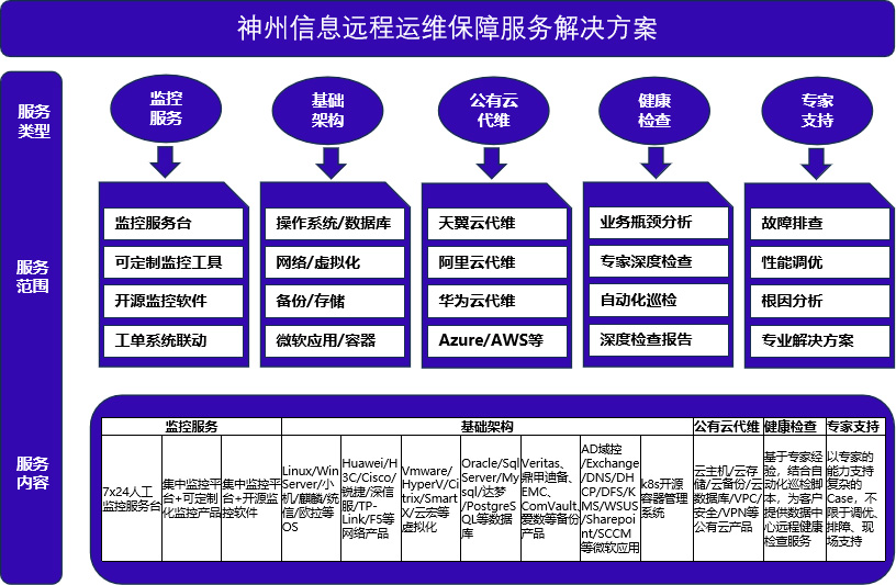 依托7×24小时智能监控中心、、、、专业化运维管理平台及资深级技术专家团队,,,,构建三位一体的远程运维服务体系,,,,提供包括对公有云、、、私有云、、机房、、网络、、服务器、、、操作系统、、、、存储、、、备份、、、数据库、、、、中间件、、、、应用、、安全等ICT基础设施的远程保障服务。。。为客户数字化转型、、、人工智能、、、云计算、、、、物联网、、、、区块链、、、数字资产等前沿技术领域保驾护航,,,,驱动客户数字创新进程。。