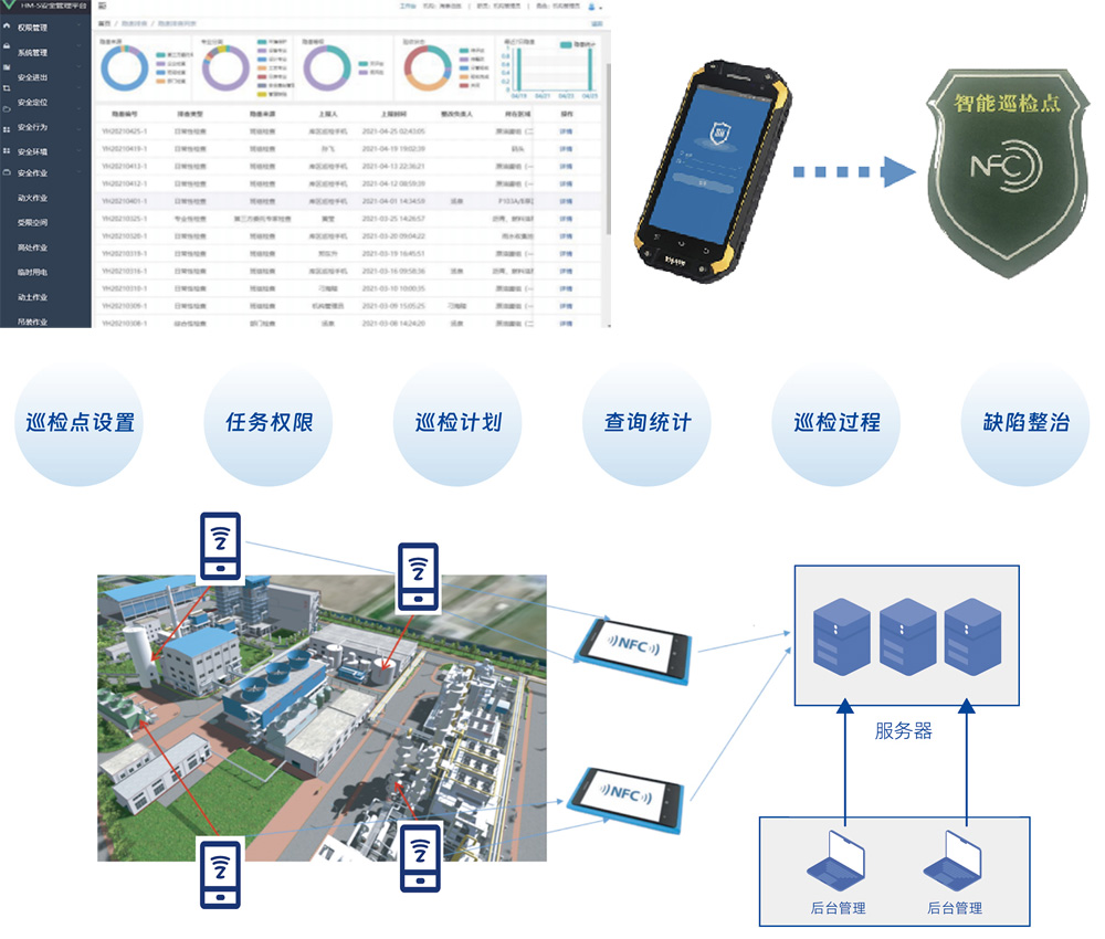 • 采用手机 NFC 的实现方式不但能够实时连接厂内网络,,,NFC 标签还避免了二维码容易损坏和可以复制的缺点。。。